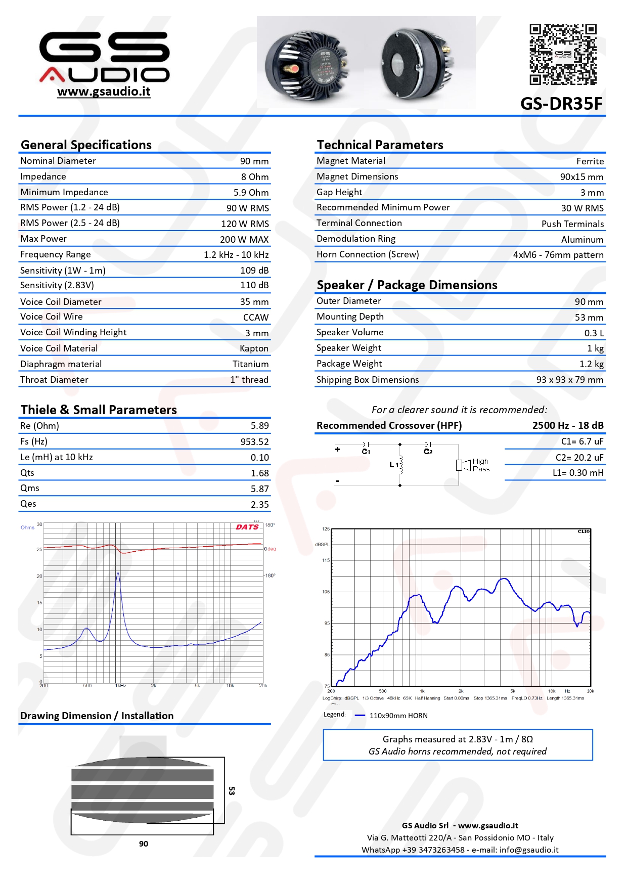 GS Audio DR35F - Driver 1.2-10 kHz, 8 Ohms, 90 WRMS - Screw Mount 4x76mm | Optional Horn 90-110 mm