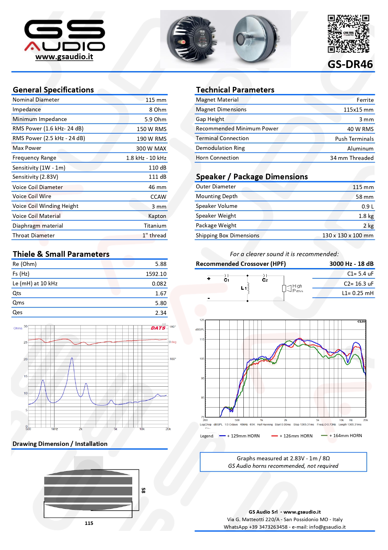 GS Audio DR46 - Driver 1.6-10 kHz, 8 Ohms, 150 WRMS - 34 mm Threaded Mount | Optional Horns 126/129/164 mm
