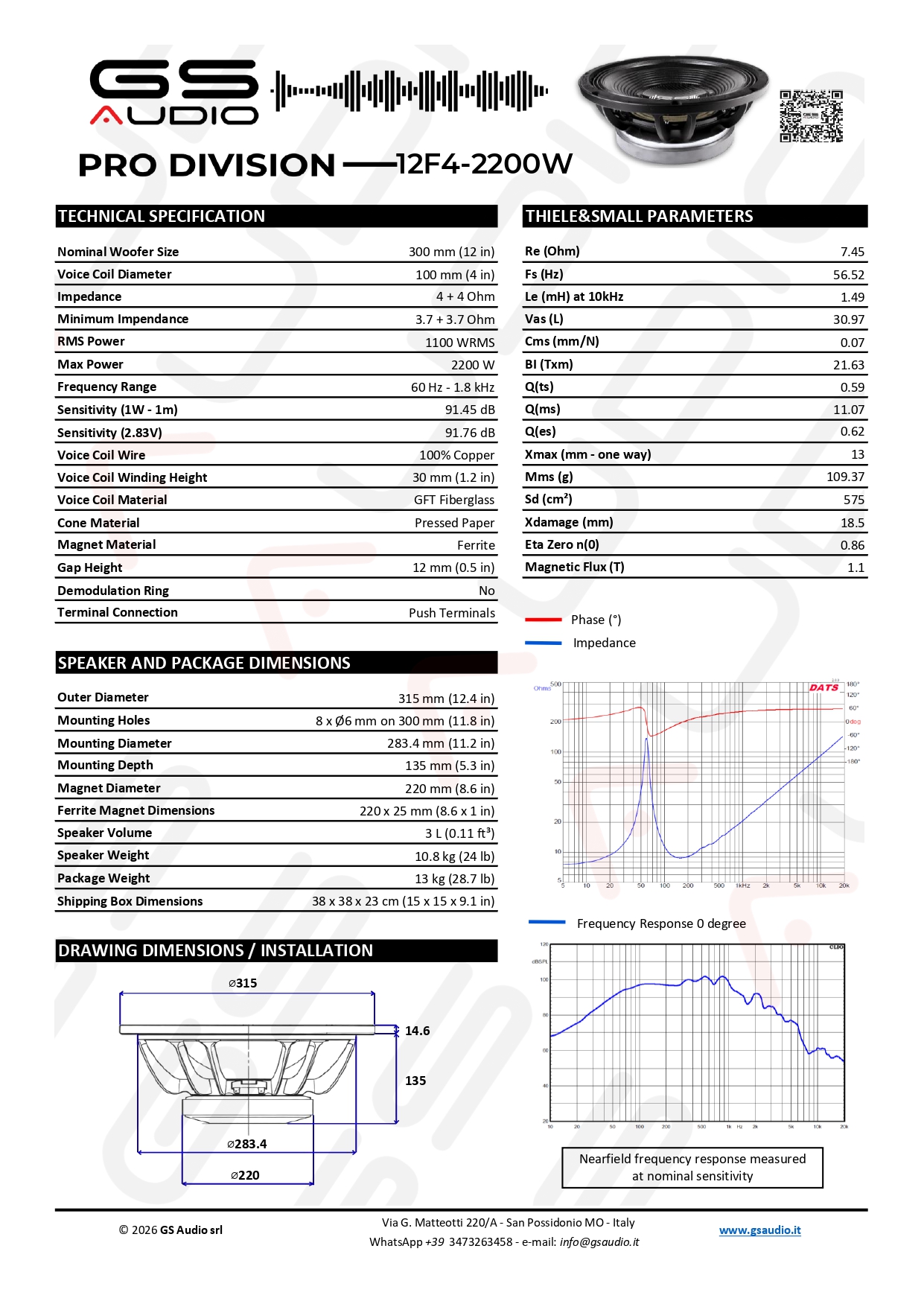 Design PhilosophyEach GS Audio Professional loudspeaker is designed as a precision instrument, not just a component. The goal is to offer natural reproduction, absolute reliability, and controlled power-essential elements for those who work with sound every day. The 15F4-1800W fully embodies this vision: a concentrate of Italian engineering, construction refinement and real performance, born to guarantee operational continuity and sound fidelity even in the most extreme conditions. It is more than a woofer: it is the first step toward a new generation of professional loudspeakers Made in Gs Audio.