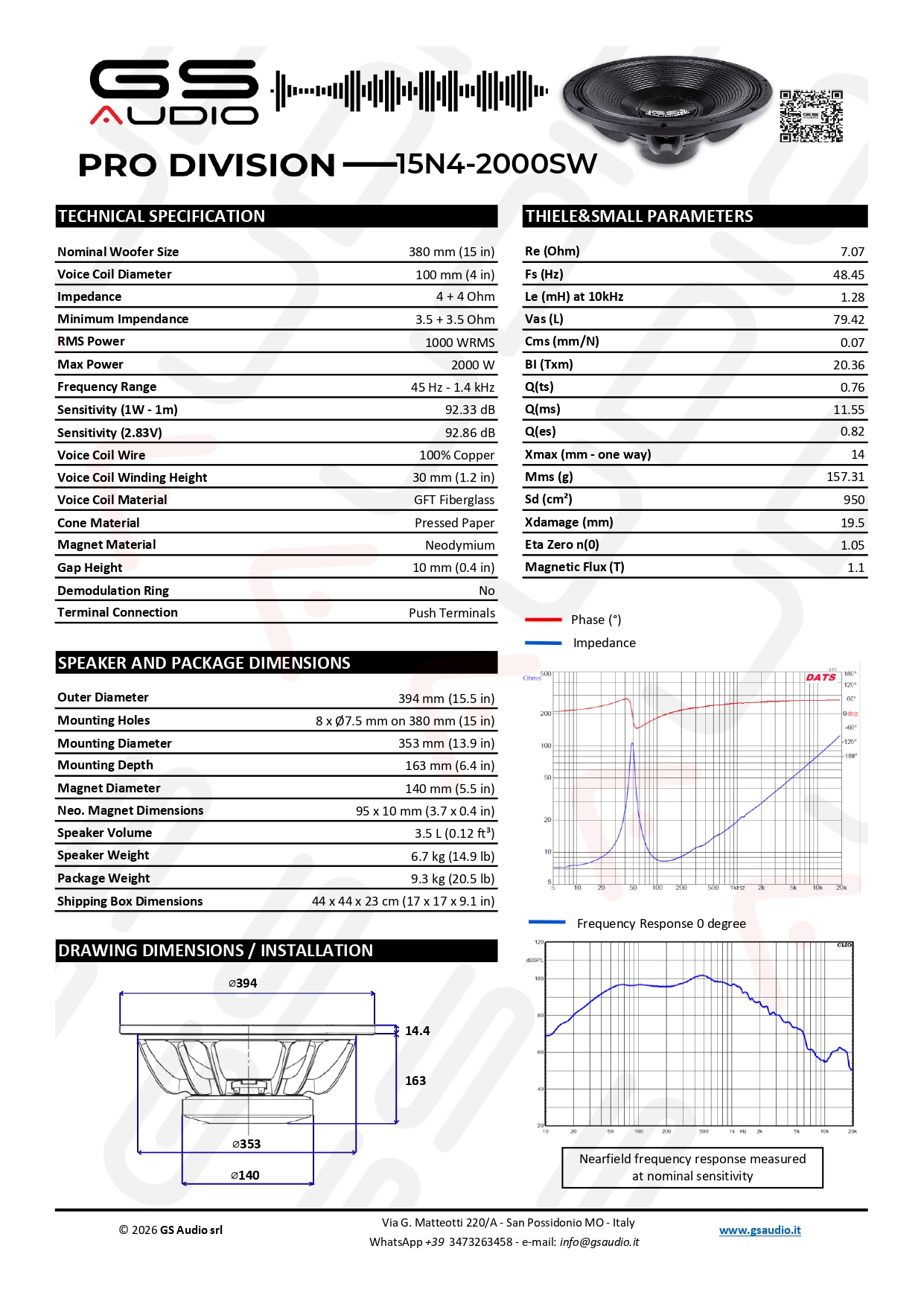 Design PhilosophyEach GS Audio Professional loudspeaker is designed as a precision instrument, not just a component. The goal is to offer natural reproduction, absolute reliability, and controlled power-essential elements for those who work with sound every day. The 15F4-1800W fully embodies this vision: a concentrate of Italian engineering, construction refinement and real performance, born to guarantee operational continuity and sound fidelity even in the most extreme conditions. It is more than a woofer: it is the first step toward a new generation of professional loudspeakers Made in Gs Audio.
