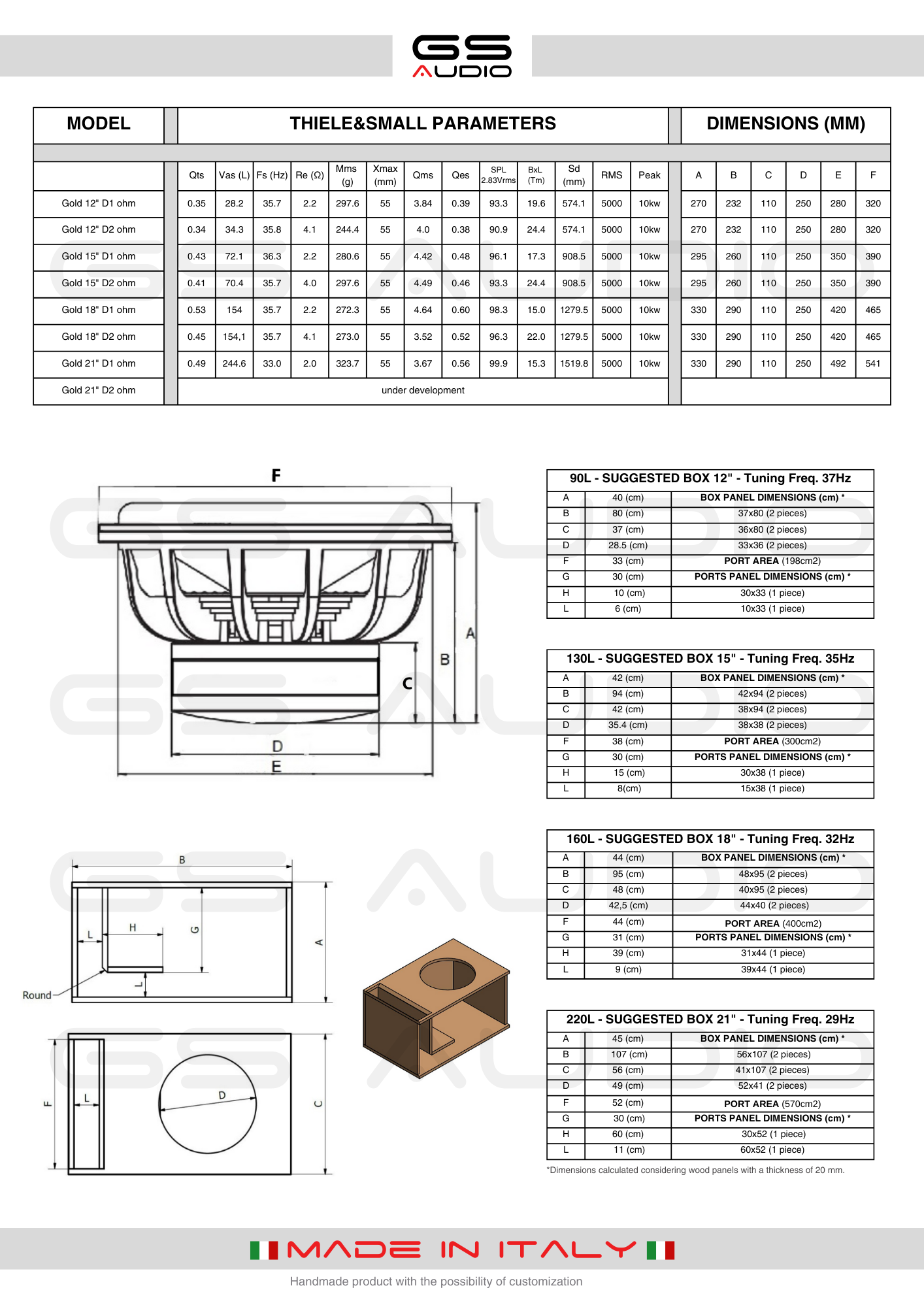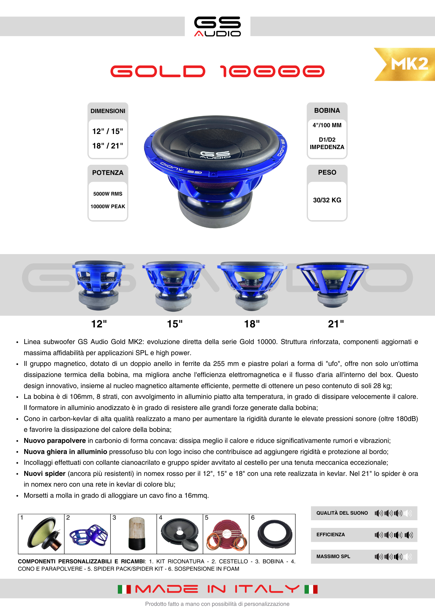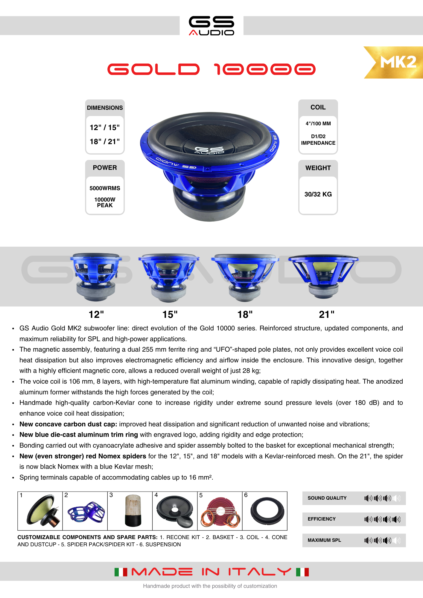 Perfect for competitions and daily use, they offer 5000 Wrms (up to 10000 W max). The data sheet includes an ideal box; for high tempo genres, reducing the box width by 2 inches improves responsiveness and 2-3 Hz tuning. Standard and customizable retuning kits available, as well as spare parts. With a power rating of 5000 Wrms (up to 10000 W max), use with amplifiers between 3500 and 8500 Wrms is recommended.