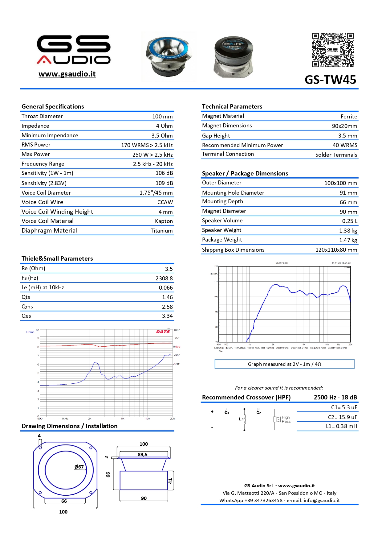 Titanium diaphragm, ultralight coil and 90mm ferrite magnet were the winning choices to achieve good linearity above 2500Hz and outstanding compactness that allows it to be installed even in small spaces.