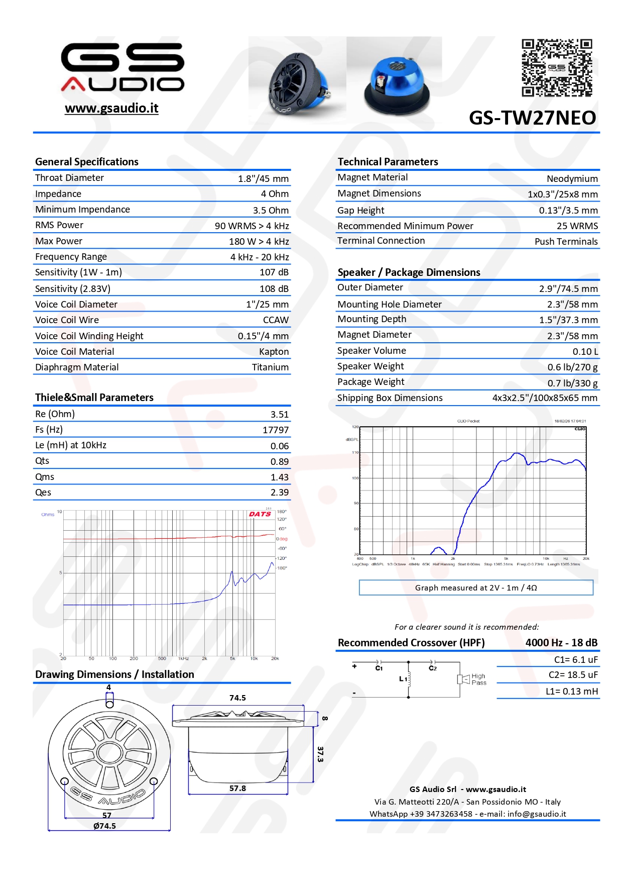 Questo nuovo tweeter, simile al 34NEO, è stato scelto per il suo suono particolarmente limpido e cristallino, con una resa sonora ancora più raffinata rispetto agli altri tweeter GS Audio.